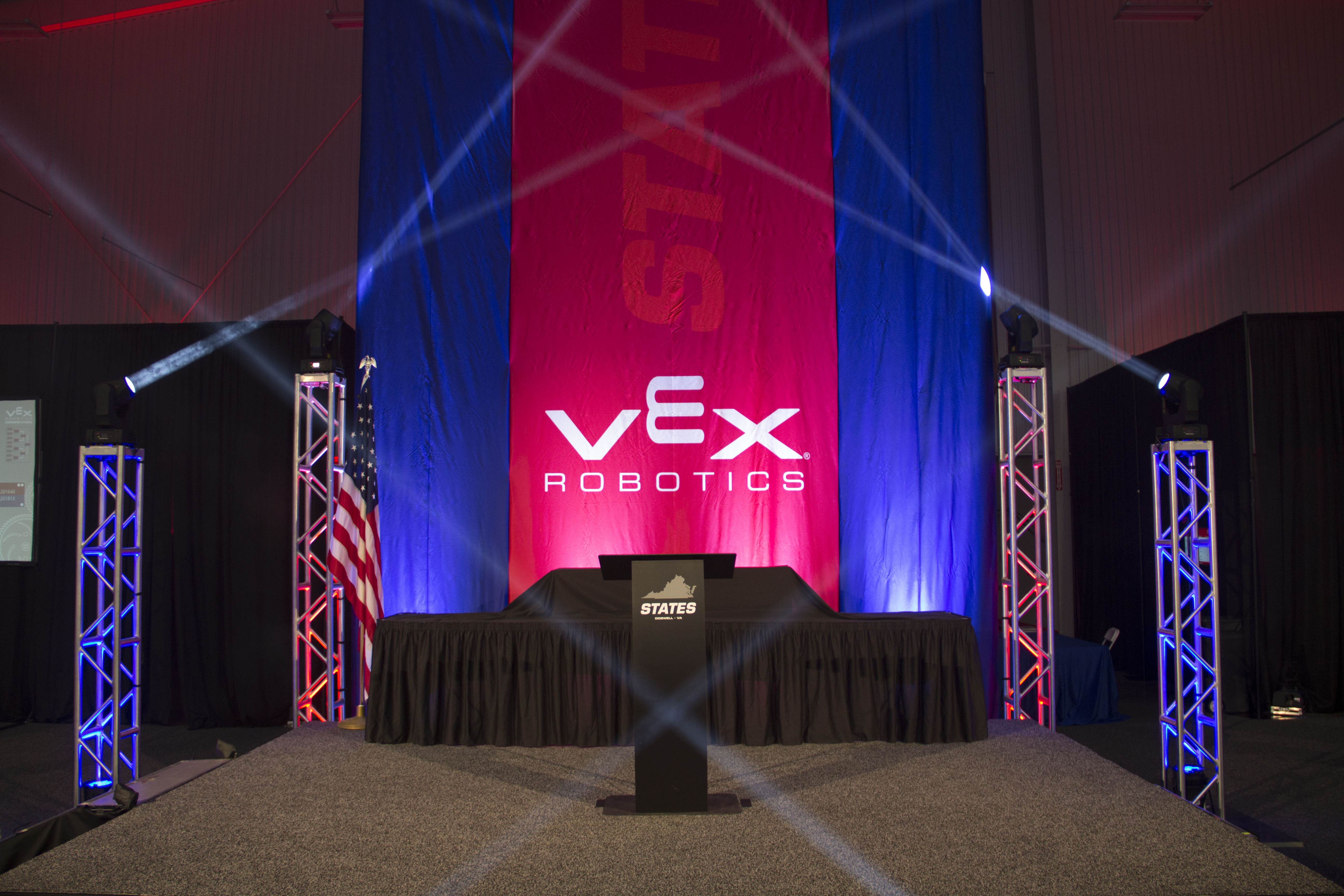 The stage is set for the Vex Robotics Virginia State Championships at Meadow Event Park. The stage is flanked by truss totems with moving head beam fixtures. The beams are visible due to a haze effect and uplighting on the upstage curtain